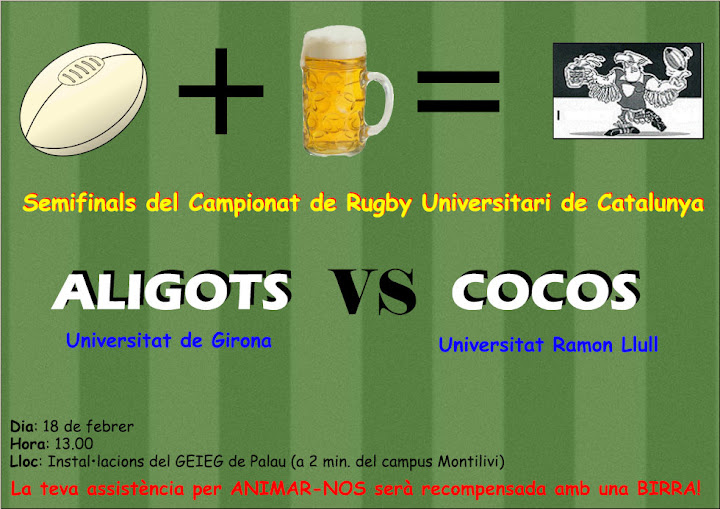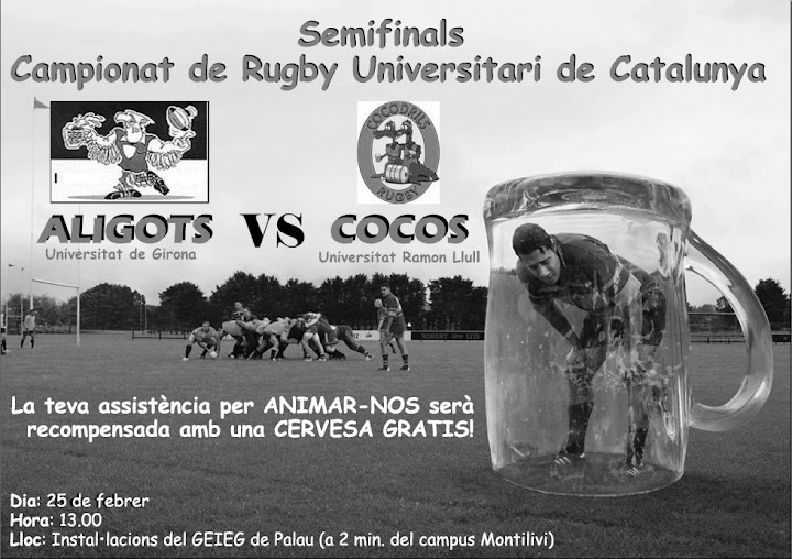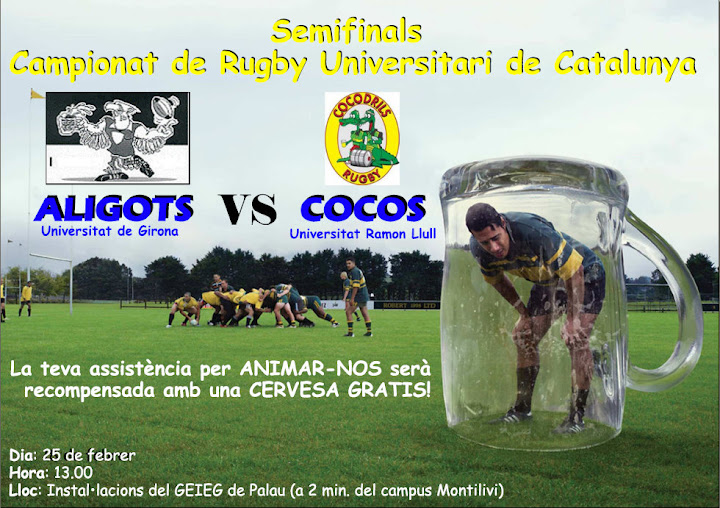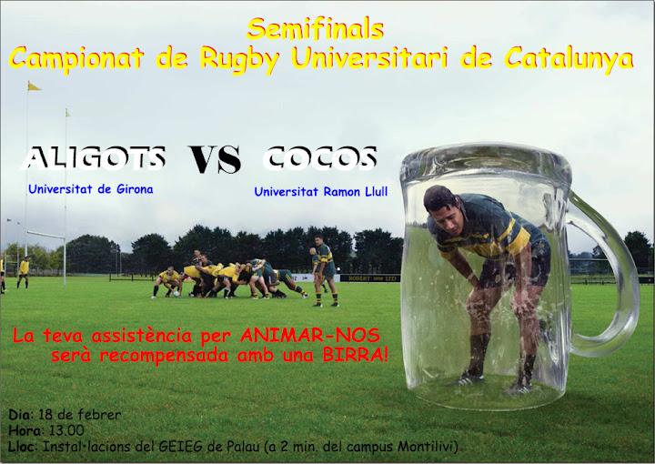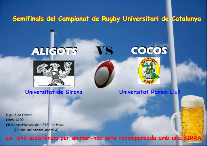 Senyors per qui encara estigui als núvols, el pròxim 18 de FEBRER, ens juguem les SEMIFINALS de copa universitaria de rugby, nose vosaltres però crec que es un fet força IMPORTANT.